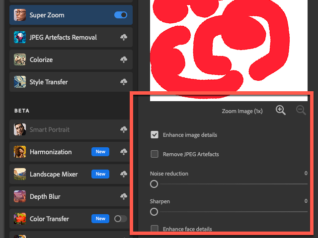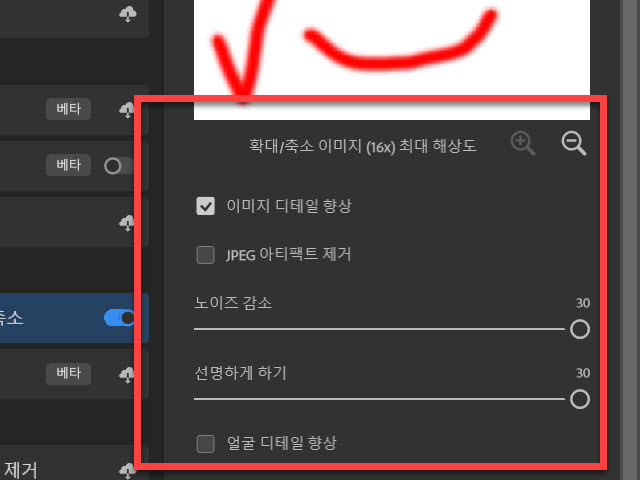 편집할 수 있는 활성화 상태에서는 한국어로 패치된 포토샵 메뉴와 같이 해상도를 높이고자 하는 이미지의 현재 비율과 줌(Zoom) 할 수 있는 돋보기 버튼, 이미지 디테일 향상, JPG 아트팩트 제거, 노이즈 감소, 선명하게 하기 그리고 얼굴 사진인 경우에 옵션을 선택하여 적용할 수 있는 얼굴 디테일 향상 의 세부 설정 옵션이 각각 동일한 위치에 영어로 배치되어 있는 모습의 공통점도 비교해 볼 수 있습니다