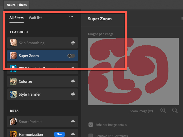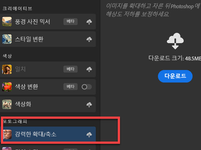 작은 사이즈의 사진을 큰 크기의 이미지로 변경할 수 있는 필터가 있는 Neural Filter 에서 한국어 표기는 포토그래피 영역 아래에 있는 <강력한 확대/축소> 라는 이름으로 표시가 됩니다