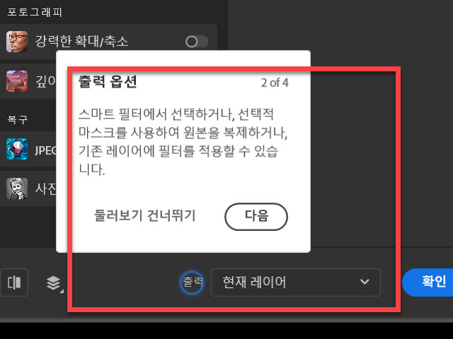 포토샵에서 해당 기능을 처음 실행하는 경우에는 간단한 설명을 볼 수 있습니다