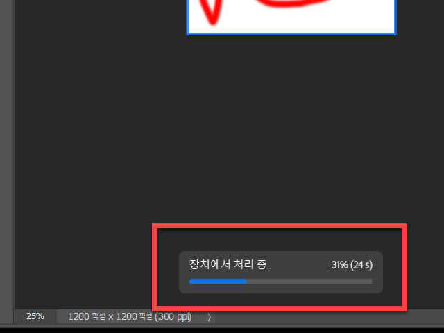 해상도를 늘리는 작업은 컴퓨터 사양에 따라서 조금 시간이 걸릴 수 있어서 진행과정 모니터링은 포토샵 좌측 하단에 그림과 같이 <장치에서 처리 중> 의 표시와 진행율 게이지로 확인해 주시면 됩니다