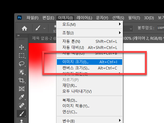 이미지 사이즈를 키우려는 파일을 포토샵에서 불러오기까지 하셨다면 <이미지> 메뉴 아래에 있는 <이미지 크기> 항목을 마우스로 찾아 클릭하는 방법과