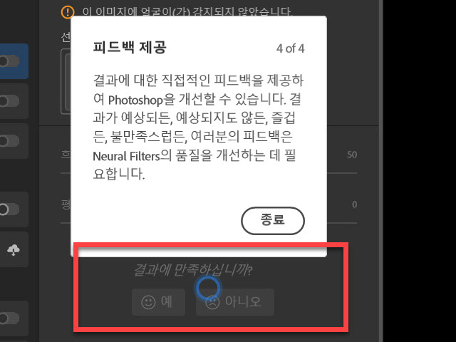마지막으로 결과에 만족 여부의 피드백 전달을 요청하는 안내 메시지 아이콘 설명으로 마무리하는 모습을 볼 수 있습니다