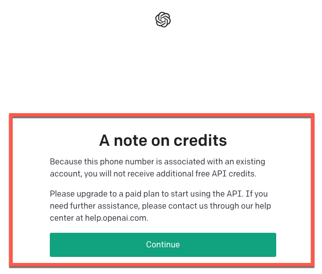 동일한 휴대폰 전화번호를 이전에 openai 가입시 사용하였다면 제공되는 무료 API 크레딧을 받을 수 없다는 안내를 받을 수 있습니다. 초기에 제대로 된 기능을 사용하려는 분들은 다른 전화번호를 준비하시는 게 좋습니다