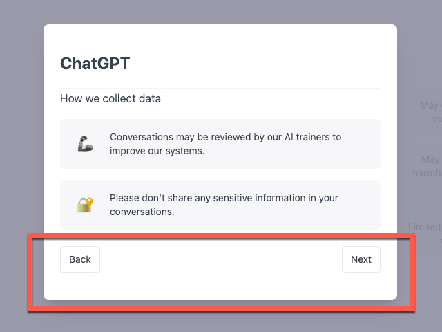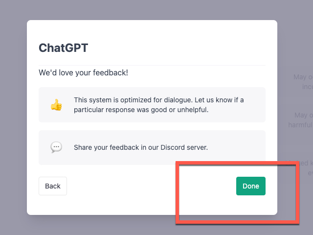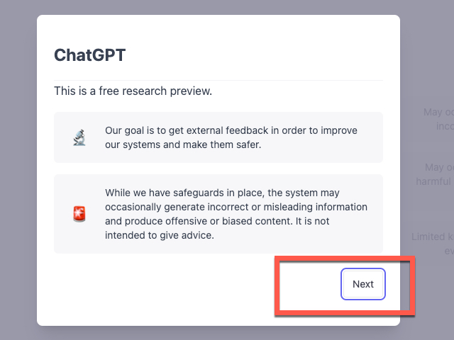 Chatgpt를 시작하기 전에 안내 전달 메시지로 몇 가지 사항에 대한 팝업 창으로 표시가 됩니다