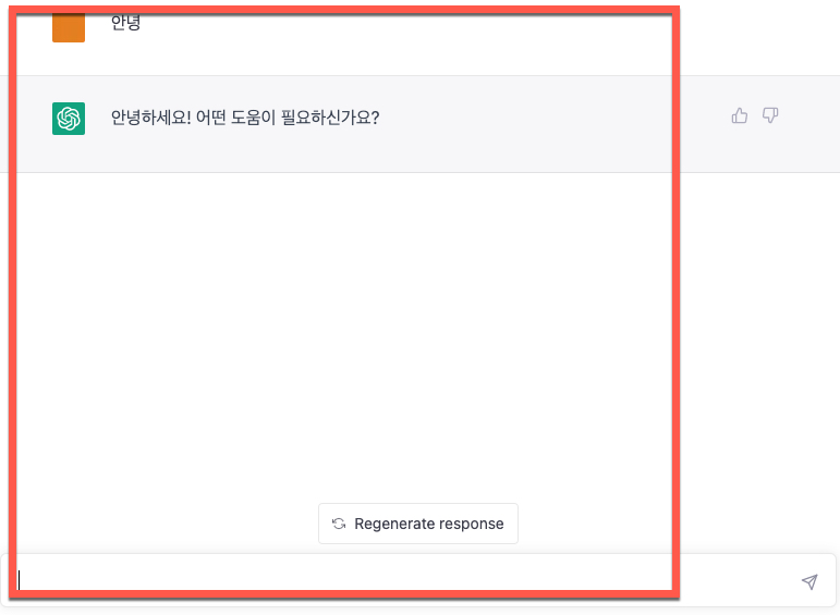 웹 페이지 아래의 채팅 창에 한글로 질문을 하여도 언어 변경 등의 요청이 없어도 ai는 한글로 사용자가 대화를 시작할 수 있다는 것을 알 수 있는 처음 인사 채팅 모습입니다