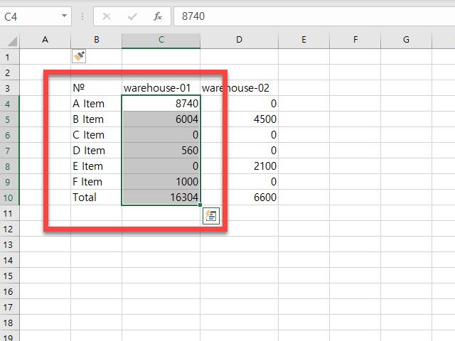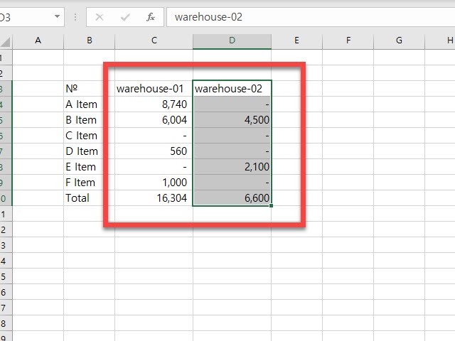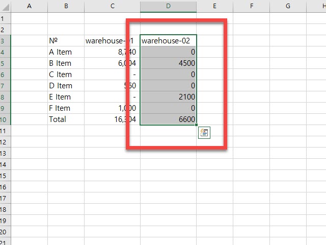 우측의 warehouse-02의 입력한 데이터 중 수정이 필요한 영역을 선택 후