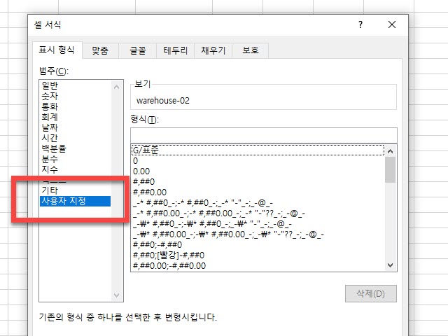 셀 서식을 선택 후 <표시 형식> 탭을 선택된 상태의 좌측에 있는 <범주> 의 가장 아래 부분에 있는 <사용자 지정> 을 선택합니다