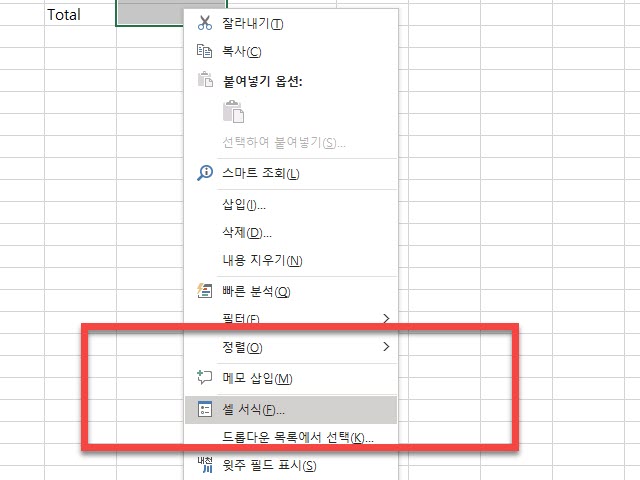 마우스의 우측 버튼을 클릭하여 표시되는 팝업 메뉴의 <셀 서식> 을 활용하는 이전 포스팅을 사용하면