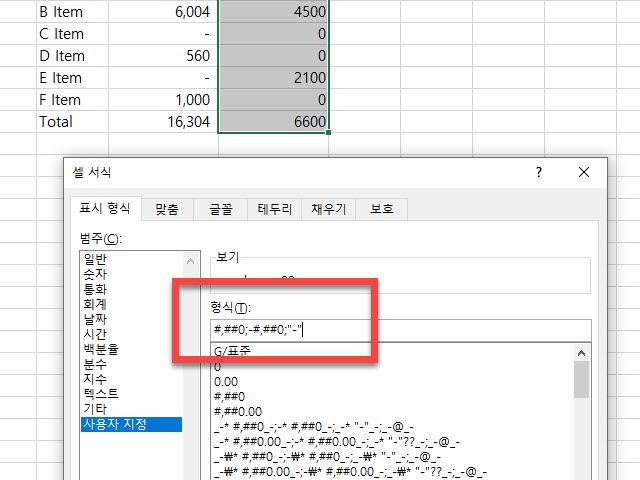 0 숫자를 “-“ (Dash)로 표시할 수 있는 2번째 방법으로 셀서식(Format Cells)의 사용자 지정으로도 작업할 수 있는 모습을 보았습니다