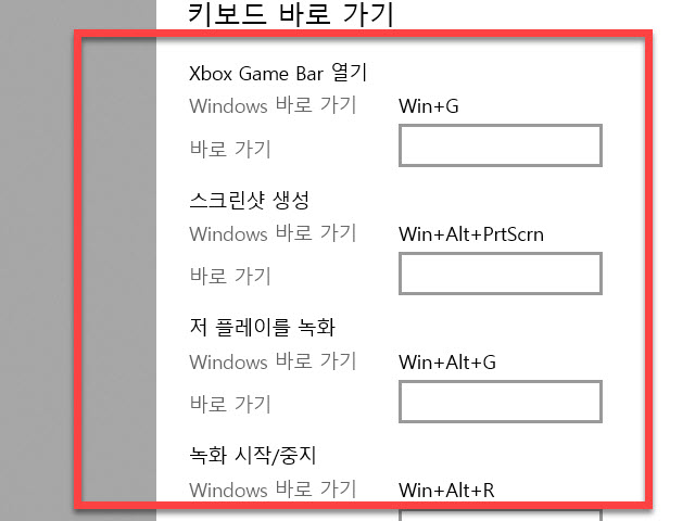 우측의 “키보드 바로 가기” 의 윈도우 화면 녹화 시 사용하게 되는 기본 단축키를 볼 수 있습니다