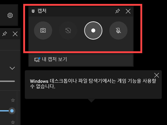엑스박스 게임바를 열면 캡쳐 버튼 상태와 소리 녹음의 상태도 시각적으로 확인할 수 있습니다
