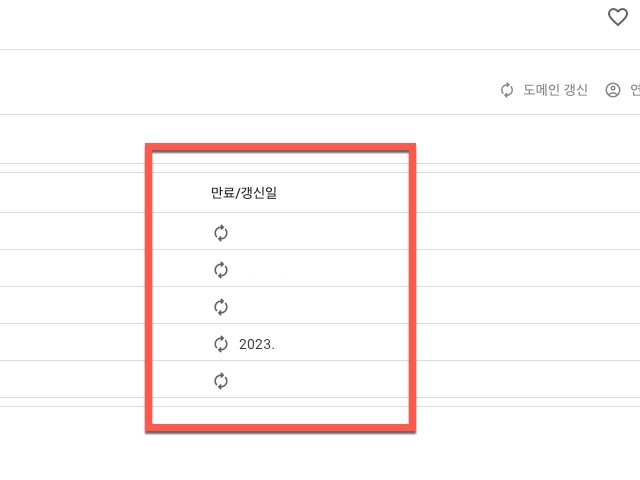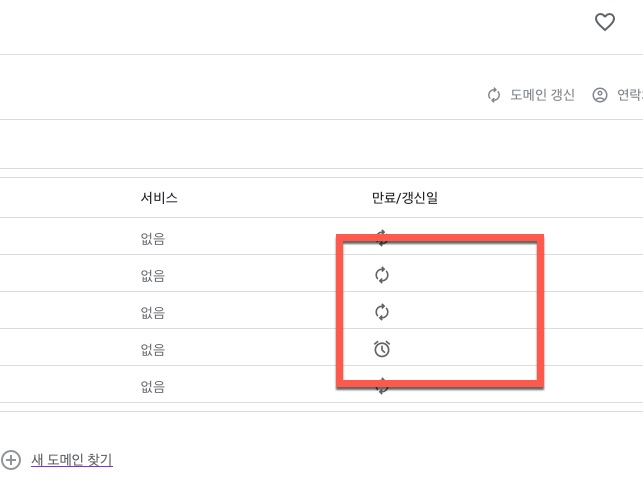 그리고 또 다른 변화는 사이트 처음 화면에서 보았던 <만료/갱신일> 에 그려져 있는 아이콘이 자동 갱신 기능을 해제한 도메인은 알람 시계로 바뀌게 됩니다