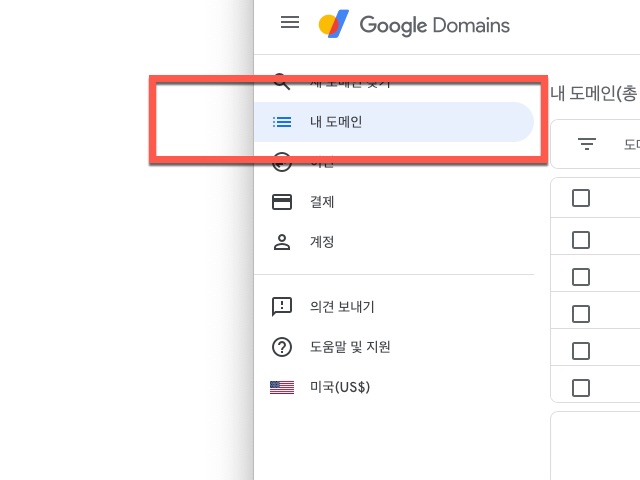 구글 도메인 사이트로 로그인하셨다면 좌측에 있는 <내 도메인> 메뉴를 찾아 클릭하면 이곳에서의 계정으로 등록 관리되고 있는 도메인 목록을 볼 수 있습니다