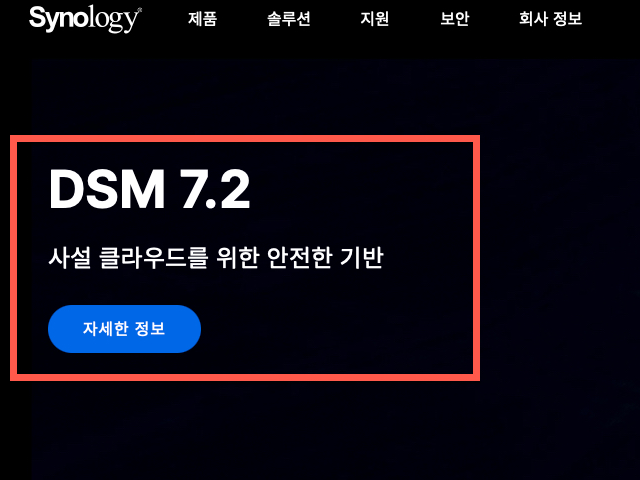 홈페이지를 찾아 이동했다면 그림과 같이 DSM 7.2 에 대한 자세한 정보를 찾을 수 있습니다