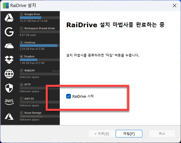 프로그램 인스톨 과정이 완료되면 즉시 실행되도록 체크 표시되어 있는 기본 값을 유지한 상태로 “마침” 버튼을 누르면 raidrive을 다시 시작버튼의 프로그램 목록에서 찾는 번거로움을 줄일 수 있습니다