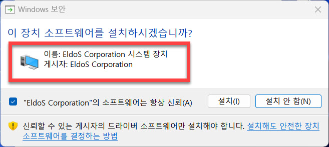 마무리 과정에서 화면과 같은 <EldoS Corporation 시스템 장치> 의 설치를 위한 새로운 윈도우 창에서는 “설치” 버튼을 선택해 주시면 됩니다