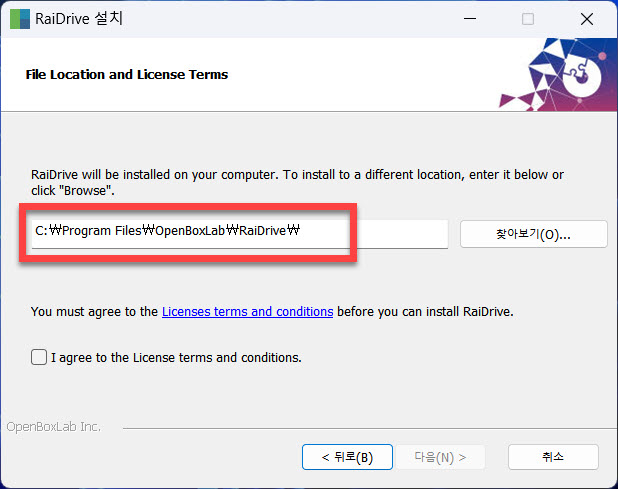 프로그램 응용 앱을 Windows OS에 설치하게 되는 기본 설정 경로를 유지한 상태에서 아래에 있는 <I agree to the License terms and conditions.> 의 동의 체크 박스가 표시 상태로 변경 되도록 클릭하여 “다음” 단계로 이동할 수 있는 버튼의 활성화가 되도록 해주시면 됩니다