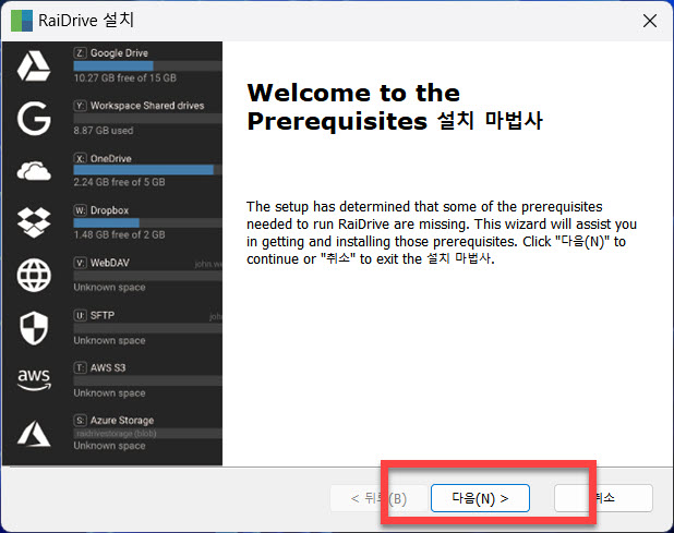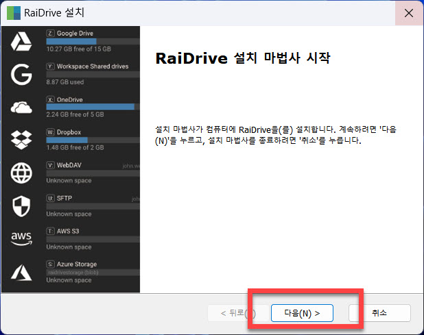 본격적인 설치 진행을 위해서 <다음> 버튼을 클릭하면