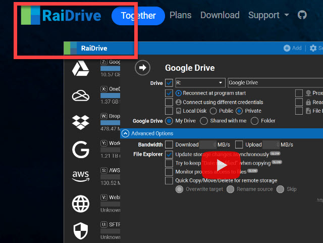 홈페이지 처음 화면에서는 무료로 도 사용할 수 있는 <RaiDrive> 에서는 응용 프로그램의 설치 완료 후 세팅 옵션 등을 먼저 살펴볼 수 있도록 유튜브 영상 링크를 배치하여 미리 볼 수 있도록 되어 있습니다