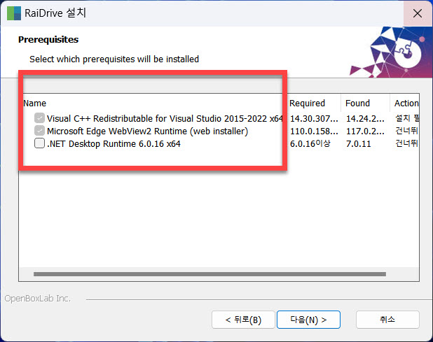 Visual C+ + Redistributable for Visual Studio, Microsoft Edge Webview 2 Runtime (web installer), .NET Desktop Runtime 이 사전에 설치되어 있어야 하는 프로그램의 현재 상태를 볼 수 있습니다