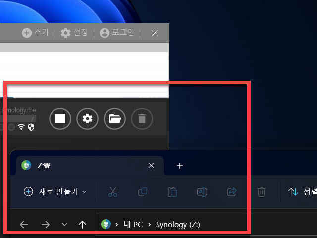 드라이브에 로그인 된 상태에서 폴더 모양의 아이콘으로도 선택하게 되면 이동할 수 있는 파일 탐색기의 주소창에서는 그림과 같이 초기 세팅 시 등록 선택 하였던 드라이브 명(Z:) 와 드라이브 이름(Synology) 으로 설정되어 있는 모습을 확인할 수 있습니다