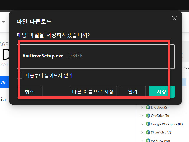 RaiDriveSetup 파일 이름을 가진 EXE 실행파일 확장자를 가진 파일을 기본 다운로드 폴더에 저장하기 보다는 다음에도 사용할 수 있는 경우를 대비하여 USB 외부저장장치나 별도의 폴더에 보관할 수 있도록 “다른 이름으로 저장” 버튼을 사용하여 저장 폴더 위치를 지정해 주시는 것도 다른 PC에 동일한 설치 작업 시 시간을 줄일 수 있는 방법입니다
