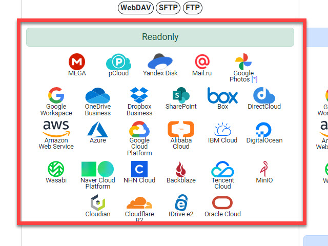 다음으로 MEGA, pCLoud, Yandex Disk, Mail.ru, Google Phốt, Google Workspace, OneDrive Business, Dropbox Business, box, Amazon Web Service, Azre, Google Cloud Platform, Alibaba Cloud, IBM Cloud, DigitalOcean, Naver Cloud Platform, NHN Cloud, Oracle Cloud, Cloudflare R2 등의 27개의 Cloud Network Drive 에서 대해서는 유료 버전과 달리 읽기(Read-only) 만 가능합니다