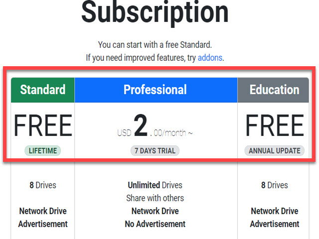 사이트 메뉴의 <Plans> 로 이동하면 <Standard> 버전의 기능 무료 버전과 함께 Professional의 1달에 2달러의 월 이용료 요금제가 있습니다