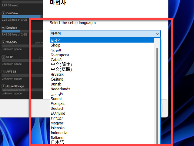 설치 시 영어, 한국어 그리고 일본어 등의 다양한 언어 변경 선택이 가능하게 되어 있습니다