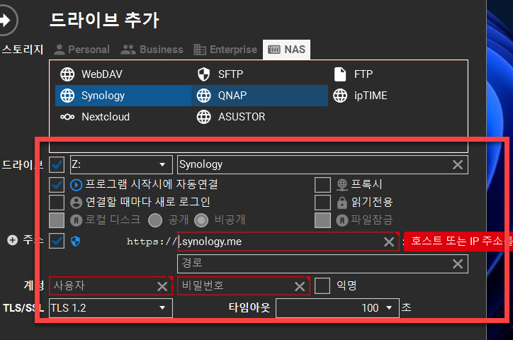 윈도우 파일 관리 탐색기에서 부여하게 되는 드라이브명과 시놀로지를 구입하여 세팅 시 사용할 수 있는 시놀로지 도메인 <사용자사용주소.synology.me> 의 전체 주소 그리고 서버에 사용하는 포트 번호도 입력이 필요합니다