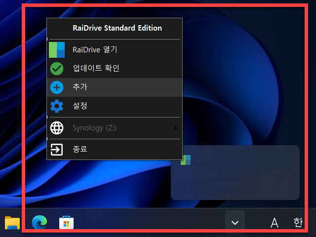 윈도우 시작 시 함께 자동 실행되도록 설정이 되어 있다면 윈도우 작업 표시줄 우측에 있는 아이콘 트레이 영역에서 설치 프로그램에서 보았던 RaiDrive 아이콘 그림을 를 찾을 수 있습니다