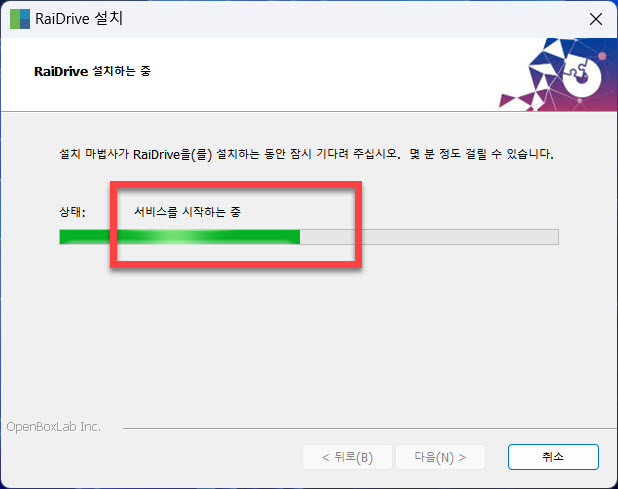 앞에 과정에서 표시되어 있던 레이드라이브에 필요한 프로그램이 미리 설치되어 있지 않았다면 정상적인 설치가 진행되지 않으면서 멈춤과 함께 별도의 표시 윈도우 창이 표시됩니다