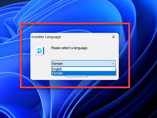 MS Windows 11 OS 버전에서 설치를 시작하면 Installer 의 첫 시작에서 한국어와 영어 버전의 언어 중에서 선택할 수 있습니다