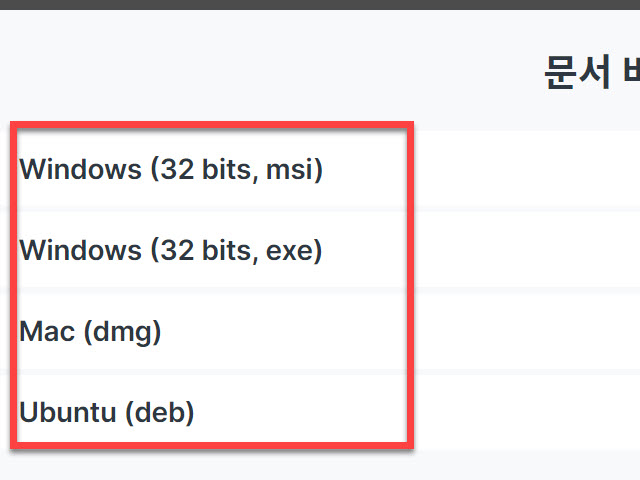 설치할 수 있는 프로그램은 윈도우의 32비트 버전의 EXE 파일과 MSI 버전, 애플 Mac OS 에서 설치할 수 있는 DMG 파일 그리고 우분투(Ubuntu) 에서도 설치할 수 있는 파일을 제공하는 것을 알 수 있습니다