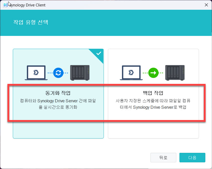 연결 확인 과정을 통과하면 다음 단계에서는 “동기화 작업” 과 “백업 작업” 의 2개의 작업 유형 중 1개를 선택하게 되어 있습니다