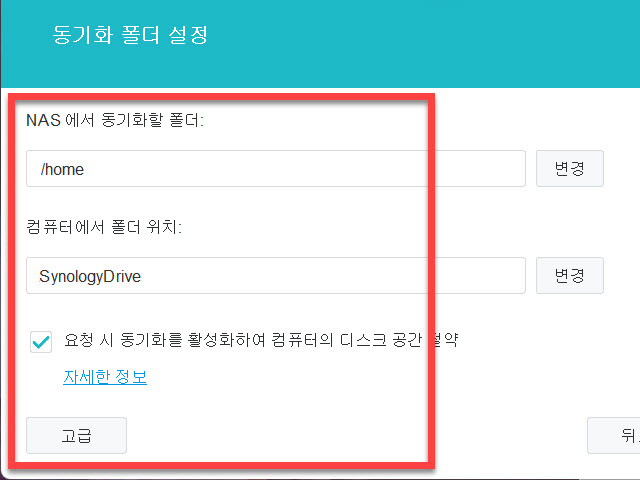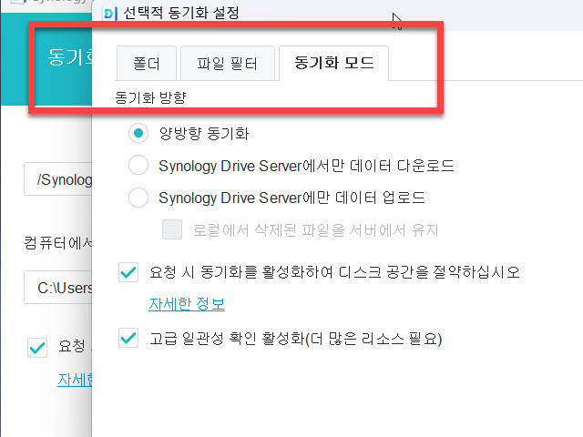 같은 윈도우 영역에 있는 ”고급” 버튼을 누르면 폴더와 동기화 모드도 바꿀 수 있는 기능을 이곳에서 찾을 수 있습니다