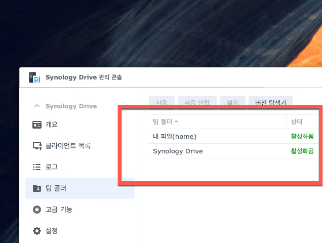 Synology Drive 관리 콘솔 팀폴더 활성화 방법