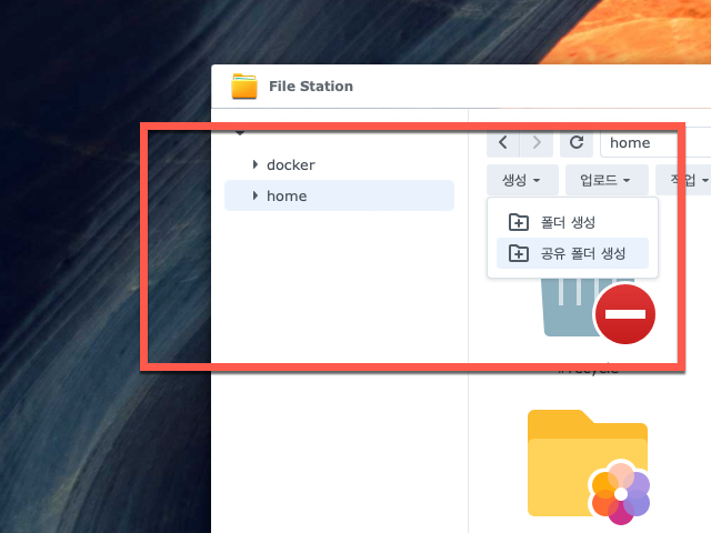 파일 스테이션(File Station) 앱을 실행하여 작업 공간으로 사용할 폴더를 만드는 작업을 사전 준비가 되어 있어야 편리합니다